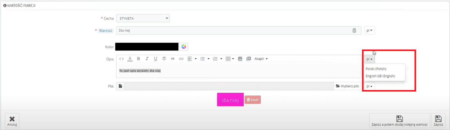 W przypadku sklepów, które posiadają więcej niż jedną wersję językową, powyższe pola mogą zostać uzupełnione osobną treścią dla każdego z języków.