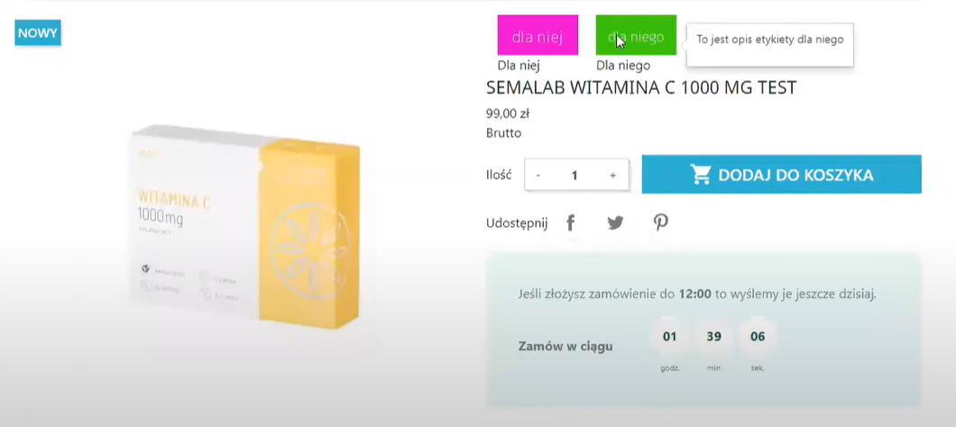 Za pomocą etykiet można również prezentować potencjalnym klientom produkty, które aktualnie objęte są rabatem lub specjalną promocją. Oto jak w praktyce działa moduł etykiety w przykładowej witrynie e-commerce.