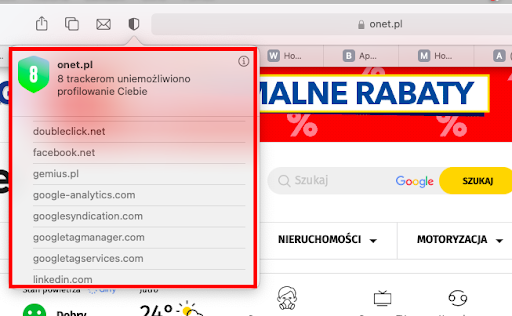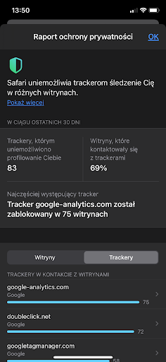 Jak widać na powyższych zrzutach ekranu, przeglądarka Safari blokuje wszystkie trackery marketingowe zaszyte w kodzie strony.