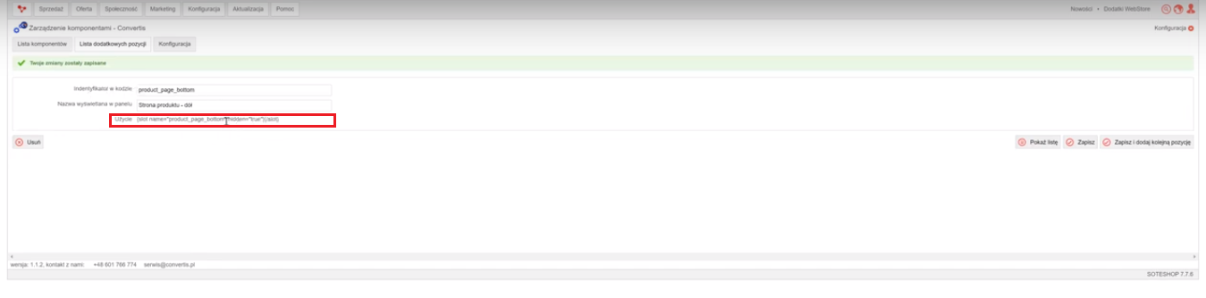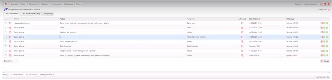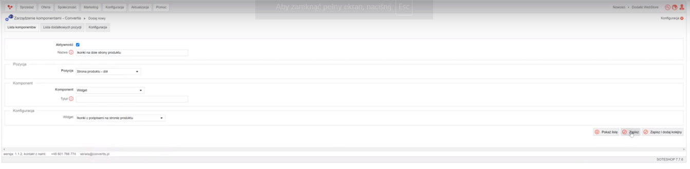 Aby stworzony widget został opublikowany na stronie internetowej należy przejść do zakładki “Zarządzanie komponentami” i wybrać opcję “Dodaj nowy”. W pierwszej kolejności niezbędne jest wskazanie nazwy dodawanego komponentu. Ważne jest wybranie także strony i pozycji, gdzie ma pojawić się nowy blok z treścią. Można to zrobić wybierając spośród dostępnych dla danego widgetu opcji. Po zapisaniu ustawień widget będzie widoczny w sklepie internetowym.