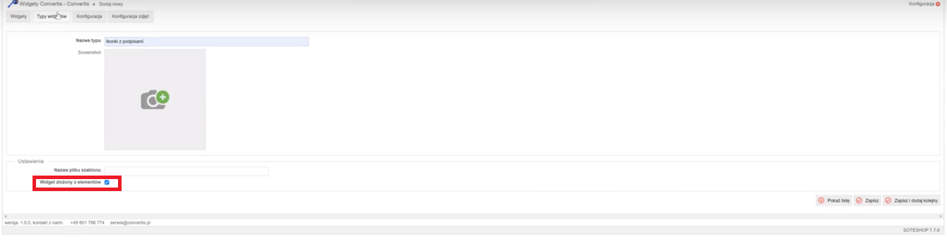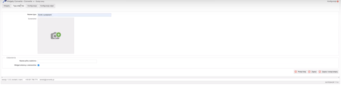 Aby zbudować własny widget, w pierwszej kolejności należy stworzyć typ widgetu. Innymi słowy, nadać mu wybraną przez siebie nazwę oraz określić template, tj. sposób wyświetlania komponentu na stronie internetowej. Plugin umożliwia dodawanie screenshotów do tworzonego typu widgetu. Ma on za zadanie prezentować styl danego komponentu dla łatwiejszego zarządzania większą ich liczbą. Webmaster na etapie tworzenia typu widgetu ma możliwość określenia szablonu komponentu, czyli jego wizualnej prezentacji w sklepie online.